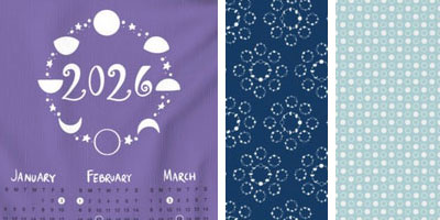 I was inspired by a science fiction book centered on the moon (I'll let you guess which one!) to dig deep into the phases of the moon. This collection includes a tea towel calendar in several colors, along with coordinating prints.